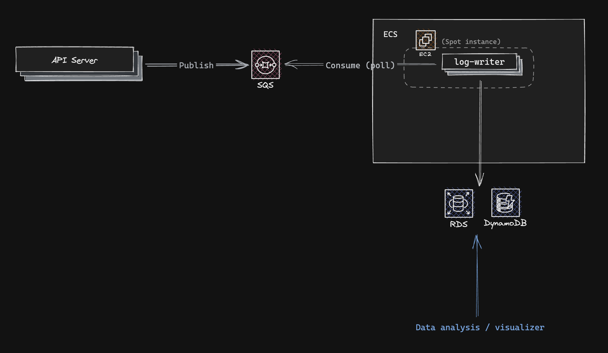 SQS에서 메시지를 읽다가 어플리케이션이 죽어도 안전하게 재시도할 수 있는데, 이 특징 때문에 log-writer는 AWS EC2 Spot instance에 띄울 수 있었습니다. Spot instance는 일반 EC2 instance에 비해 엄청나게 저렴한 대신 예고 없이 죽을 수 있다는 위험성이 있는데요, 이 때문에 일반 어플리케이션 서버에서는 사용하기 어렵지만, 이 경우에는 사용할 수 있었습니다. (DevOps팀에서 정말 많은 도움을 주셨습니다!)