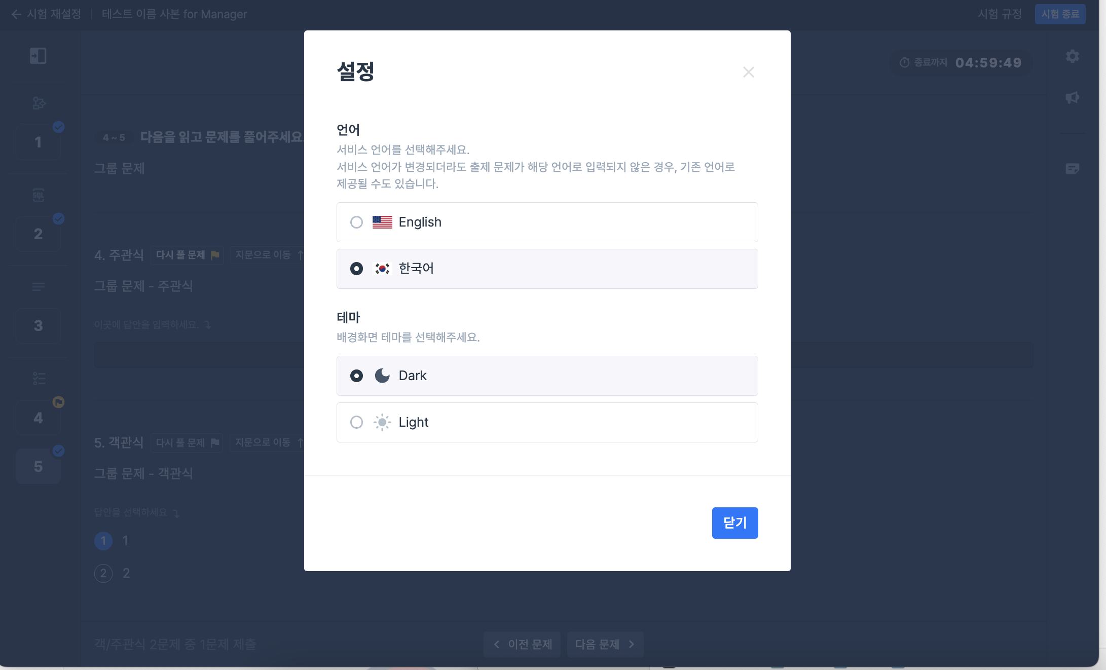 문제 풀이 환경의 언어 설정, 테마(Dark/Light)를 선택할 수 있습니다.
