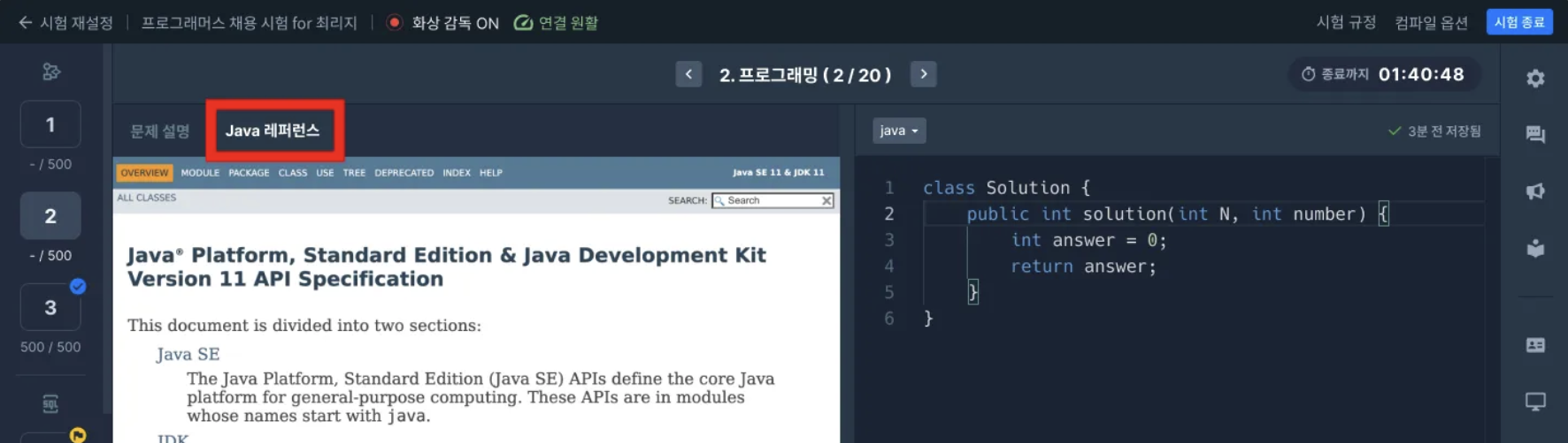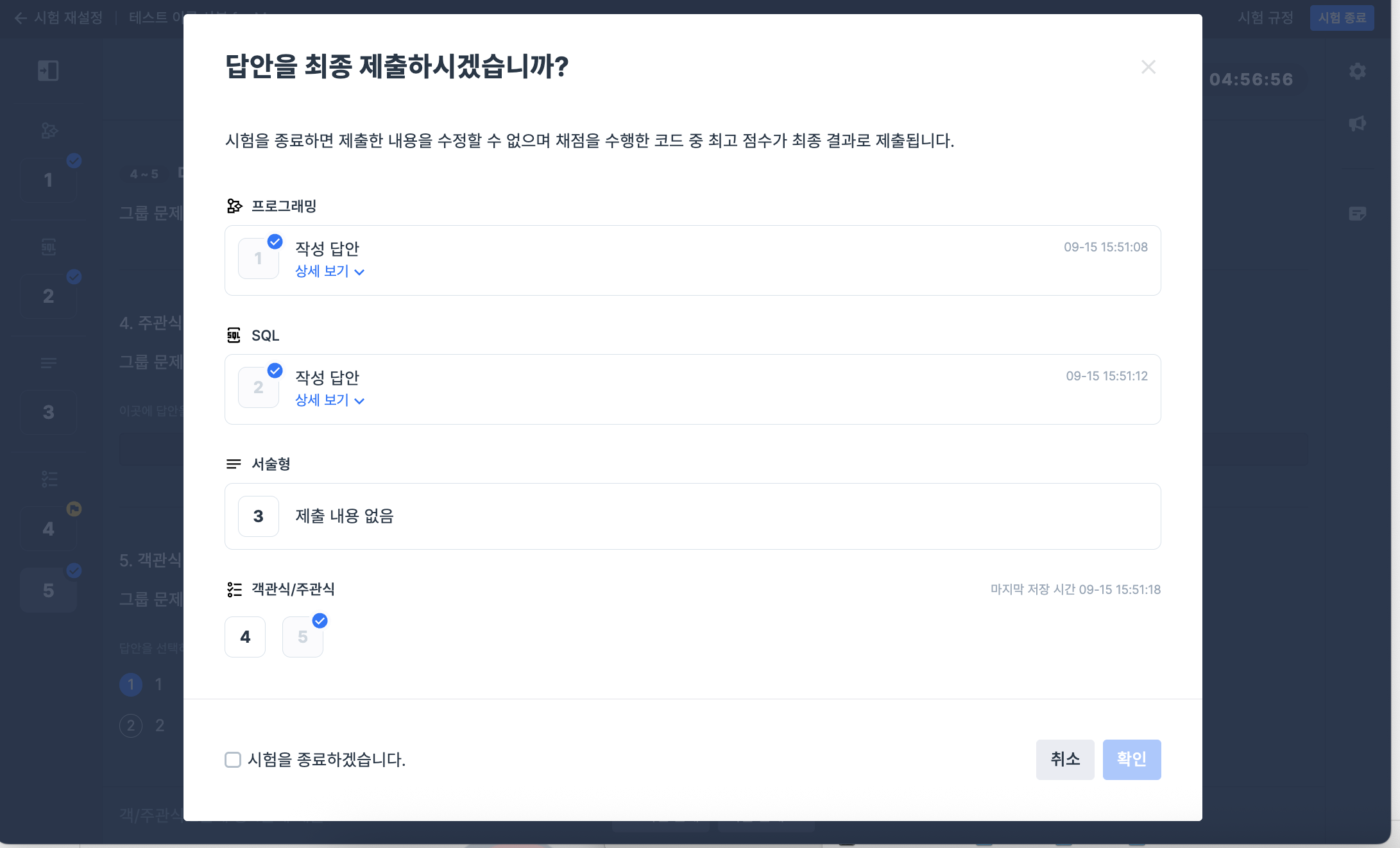 시험 종료 : 시험을 종료합니다. 종료 전 제출한 답안을 확인할 수 있습니다.