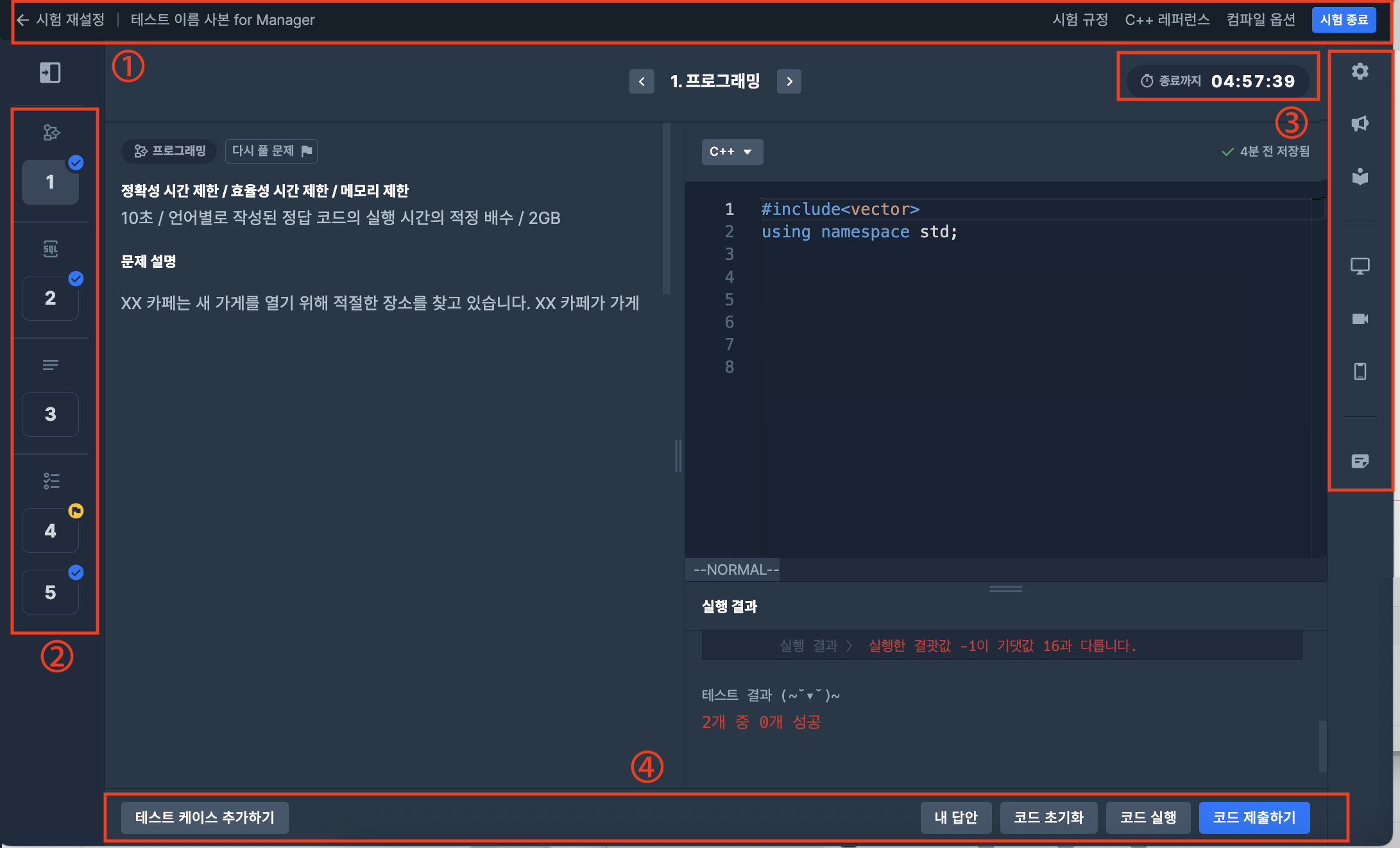코드 제출하기 : 작성한 코드를 답안으로 제출합니다. 코드 제출은 여러차례 진행할 수 있습니다