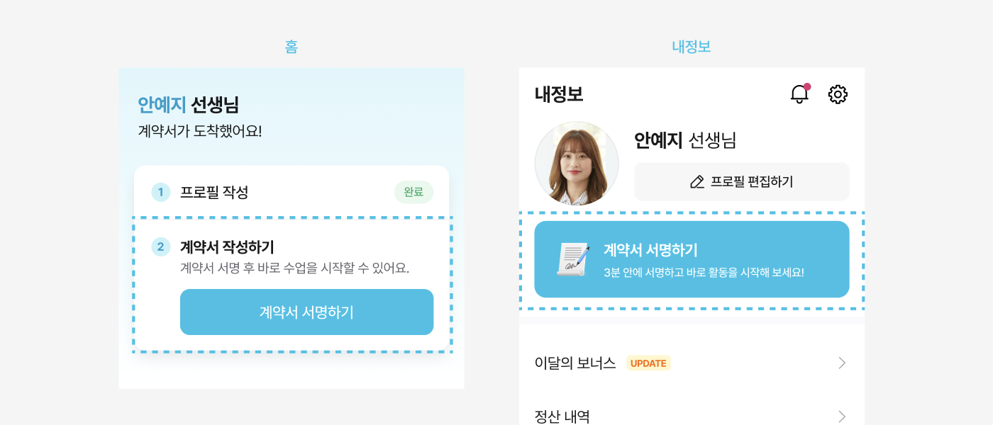 프로필 소개(프로필 사진과 자기소개)만 작성을 완료하시면, 째깍악어에서 즉시 서명하실 수 있는 계약서를 보내드려요. 앱 내 '홈' 화면 상단 또는 '내정보'에 들어가시면 [계약서 서명하기] 버튼을 찾으실 수 있어요.
