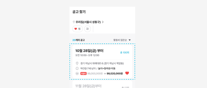 넘쳐나는 공고를 빠르게 선별하여 볼 수 있도록 공고 카드가 구성되어 있어요.