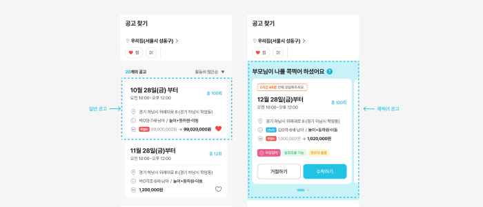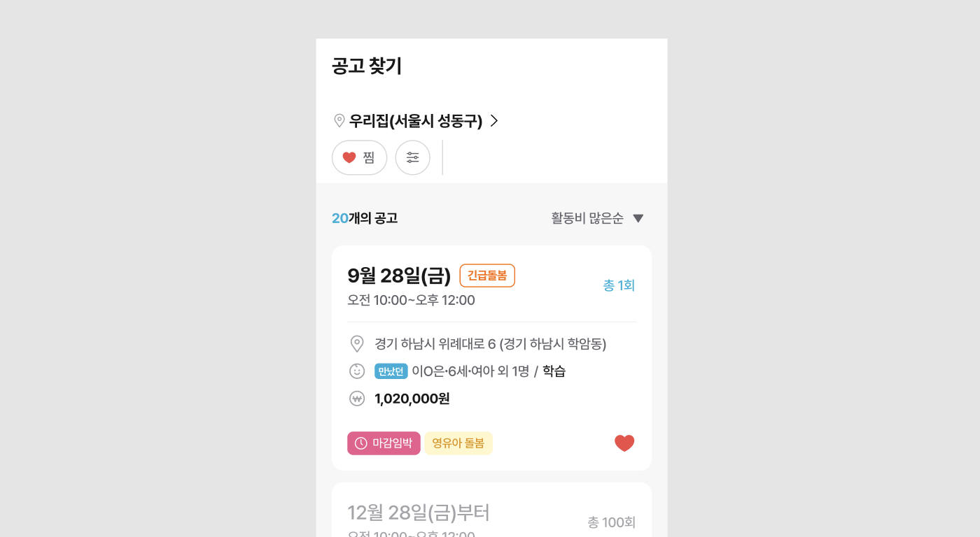 영유아돌봄 자격이 필요한 공고는 '영유아 돌봄'이라고 표시돼요.