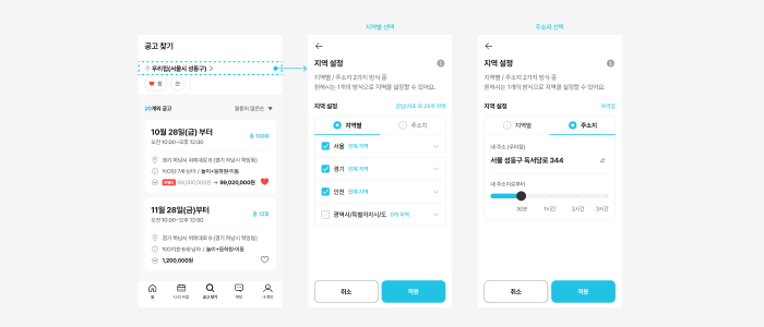 주소지 설정은 구체적인 주소를 입력하여 대중교통 이용 기준으로 30분/1시간/2시간/3시간 이내의 거리까지를 선택하여 공고를 탐색할 수 있어요. 주소지 설정은 1개만 가능해요.