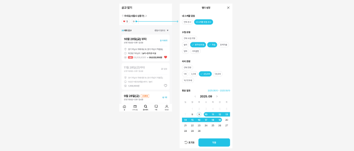 '공고 찾기' 화면 가장 상단에 있는 '필터' 아이콘을 클릭하면 필터 설정 화면으로 이동해요. 아래의 항목들을 세부적으로 설정하여 원하는 수업만 걸러서 볼 수 있어요.