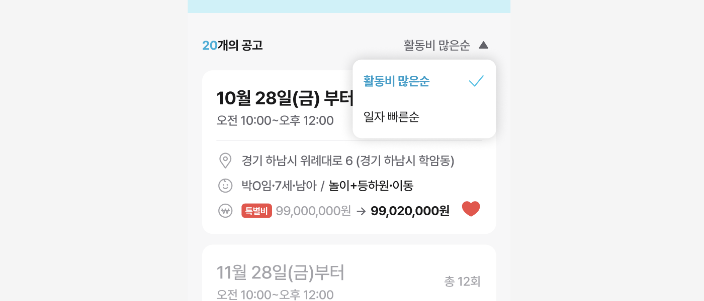 공고 리스트를 활동비 많은순 혹은 수업 일자가 빠른 순으로 정렬해서 볼 수 있어요. '공고 찾기' 화면에서 '필터'를 선택하면 공고 리스트가 정렬되니 원하는 조건으로 선택하여 활용해 보세요!