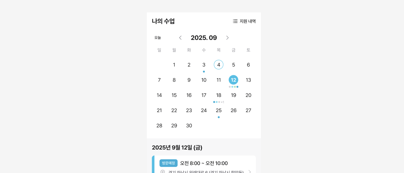 매칭이 완료되어 확정된 수업 일정은 '나의 수업' 화면에서 바로 볼 수 있고, 선생님이 공고에 지원하여 부모님의 응답을 기다리고 있는 공고에 대한 내역은 '지원 내역'으로 들어가서 확인할 수 있어요.