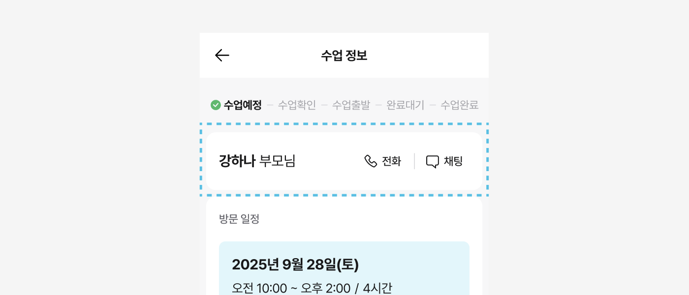 ※ 채팅으로 부모님과의 소통이 원활하지 않을 경우, 부모님에게 앱 내 [전화] 버튼을 눌러 빠르게 소통해 주세요. 이때, 전화 번호는 안심번호가 아닌 부모님/선생님 휴대전화 번호로 연락을 주고 받게 됩니다. (부모님앱에서도 선생님과 마찬가지로 매칭이 확정되면 연락처를 확인할 수 있어요.)
