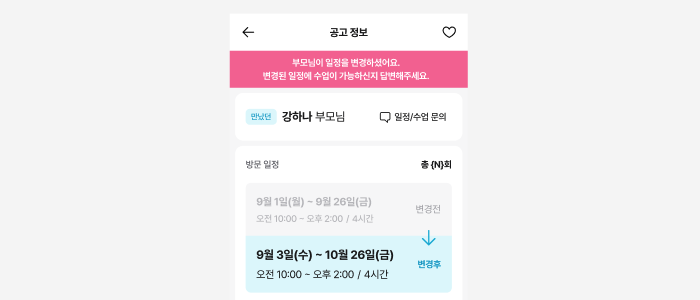 선생님 앱에서는 부모님이 올린 공고의 일정을 직접 변경할 수 없어요. 수업 일정 변경이 필요한 경우, 부모님에게 먼저 채팅으로 이야기를 해주세요.