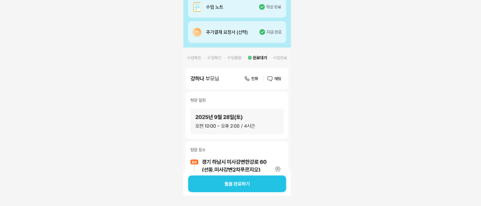 수업 노트도 작성 완료하고, 추가적으로 발생한 추가 비용까지 정산이 완료가 되면 이제 수업을 최종적으로 [완료하기] 할 수 있어요. (*수업 노트와 추가 비용 각각 요청된 경우) 선생님이 [돌봄 완료하기] 버튼을 누르면 부모님에게 돌봄 완료 알림이 나가요!
