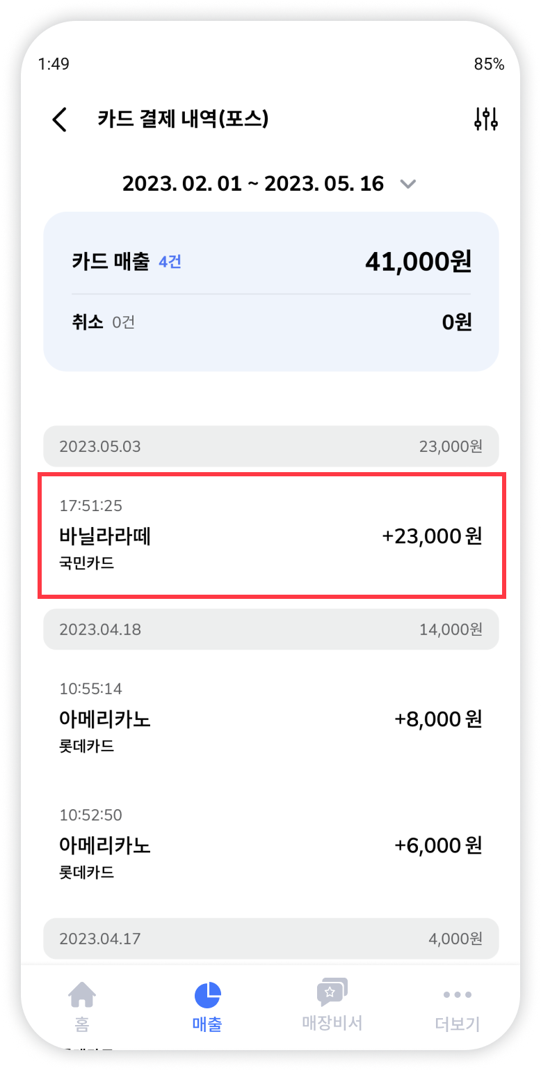 오늘얼마를 통해서는 매장에서 일어난 결제, 취소 등의 내역을 건 별로 자세하게 조회하실 수 있습니다.