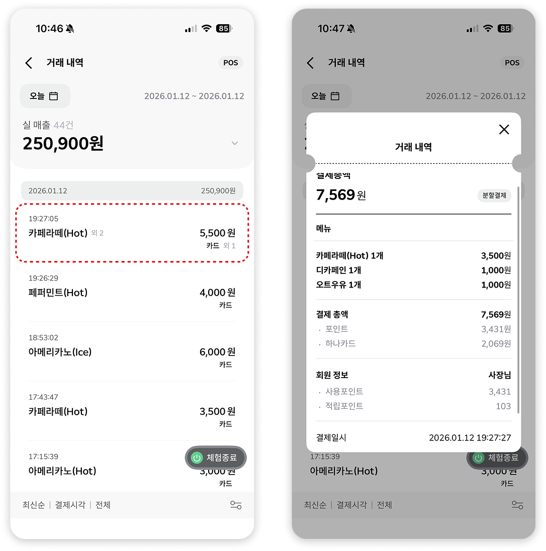 1) 메인화면 실시간 매출 하단 [거래내역] 클릭