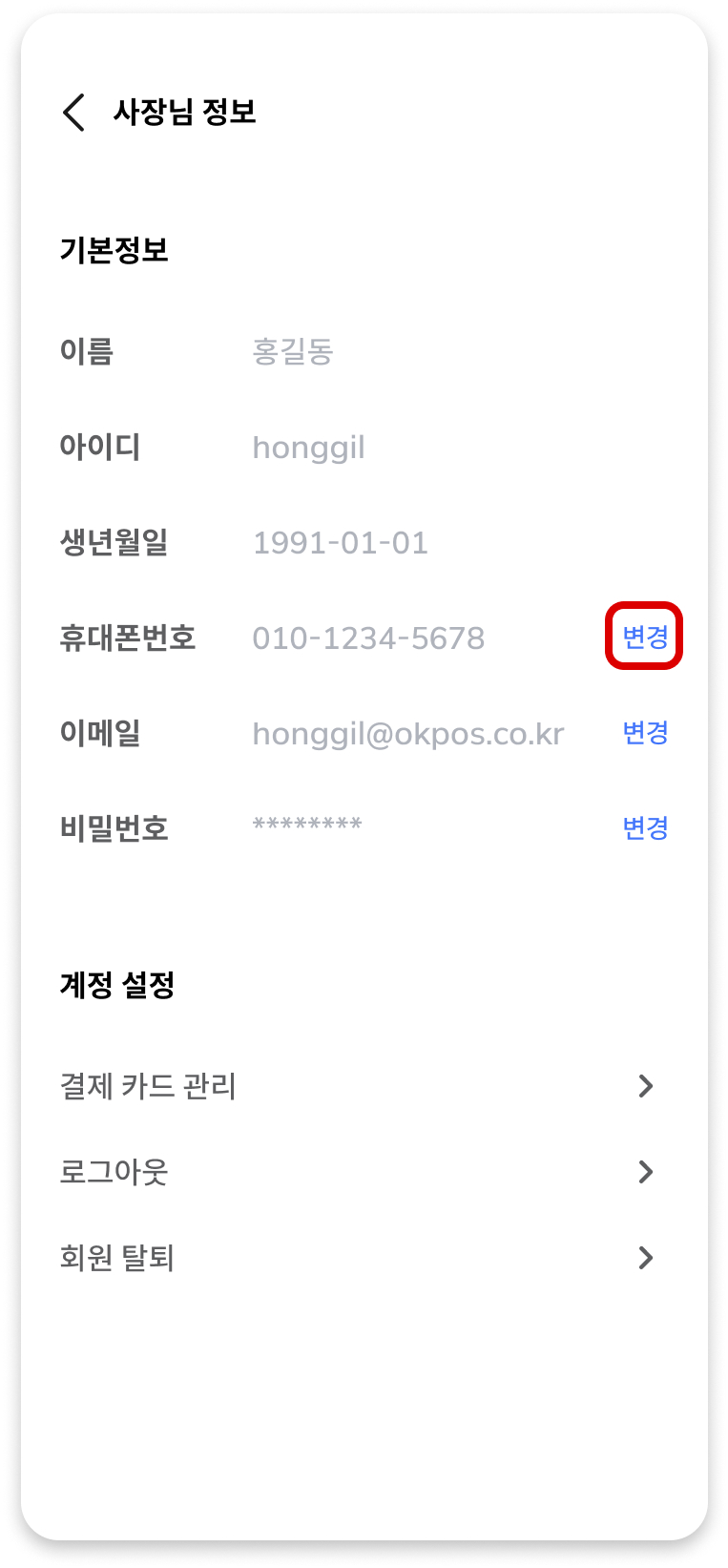 3) 사장님 정보 화면에서 휴대폰번호 [변경] 버튼을 눌러 정보 수정 화면으로 이동합니다.