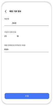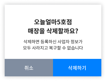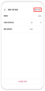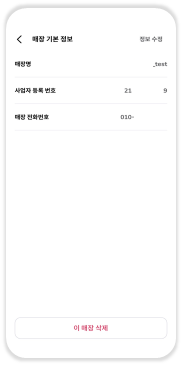 다만 정보 보안과 중복된 매장 등록을 방지하기 위해 매장의 사업자등록 번호는 임의의 수정이 불가합니다. 매장의 사업자등록번호 변경을 원하시면 해당 매장을 삭제 후 새로 매장을 등록해주세요.