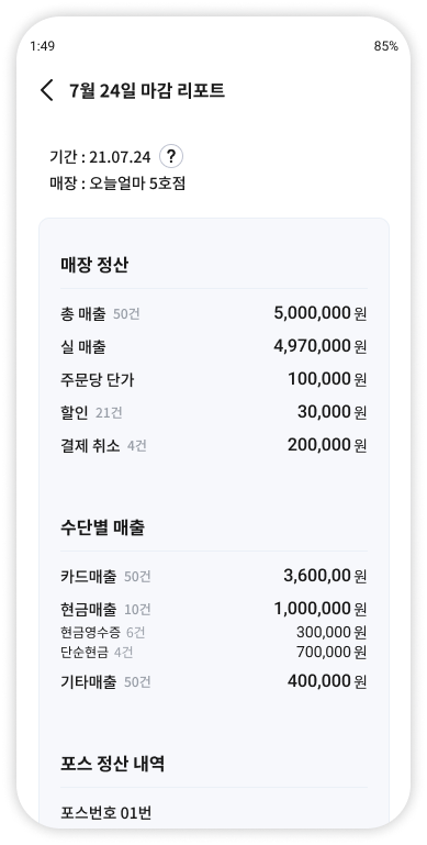 포스기 마감 시 하루의 매출 정보와 포스 정보를 요약하여 보내드리는 리포트입니다.