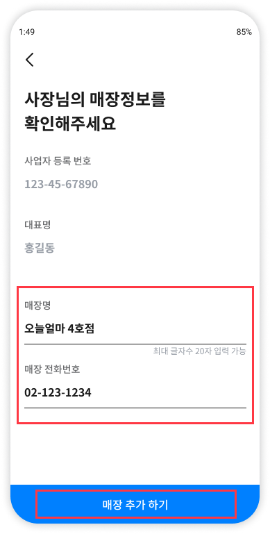 (3) 매장명과 매장 전화번호를 기입하고 [매장 추가하기] 버튼을 눌러 매장 등록을 마칩니다.