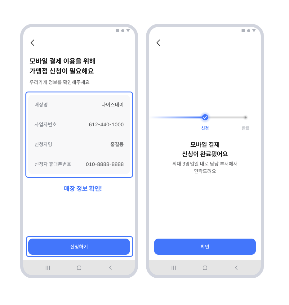 1) 모바일 결제를 이용할 매장에 대한 정보가 맞는 지 확인하고 [신청하기]버튼을 클릭해주세요.