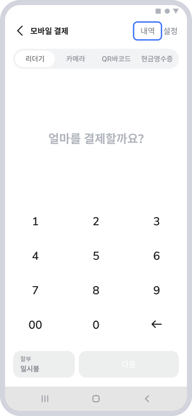 1) 금액 입력 화면에서 상단 우측 [내역] 버튼을 클릭하세요.