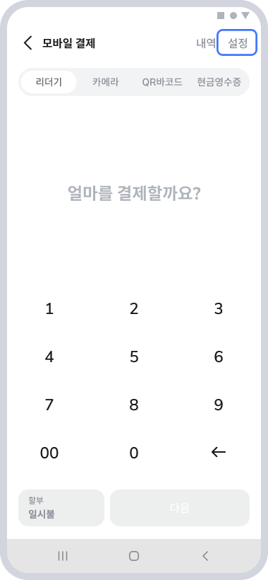1) 금액 입력 화면에서 상단 우측 [설정] 버튼을 클릭하세요.