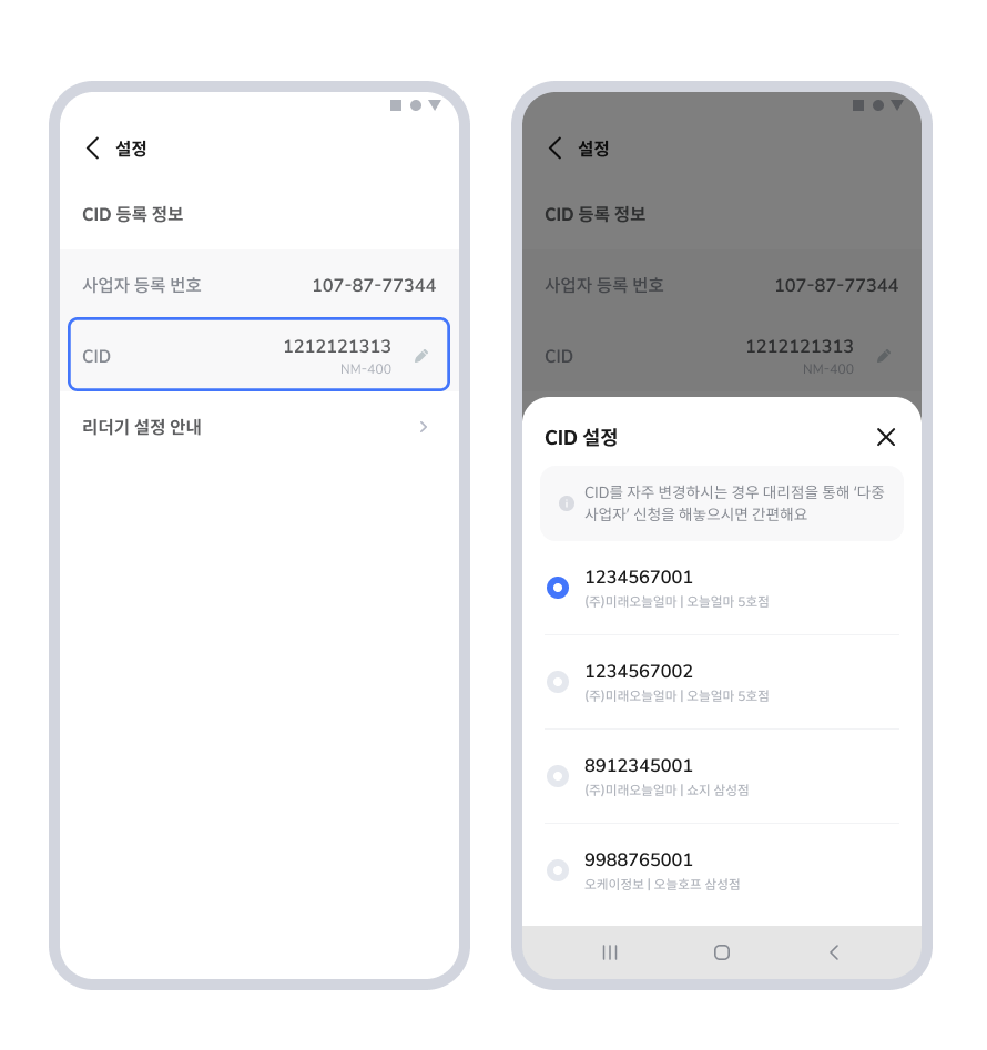 → 화면에 표시된 담당 대리점 이름과 매장명을 보고 CID가 배정된 단말기를 구분할 수 있어요.