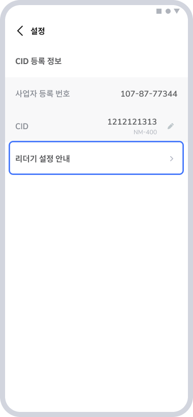 리더기 설정 방법은 [설정 > 리더기 설정 안내] 버튼을 눌러 방법을 따라해주세요.