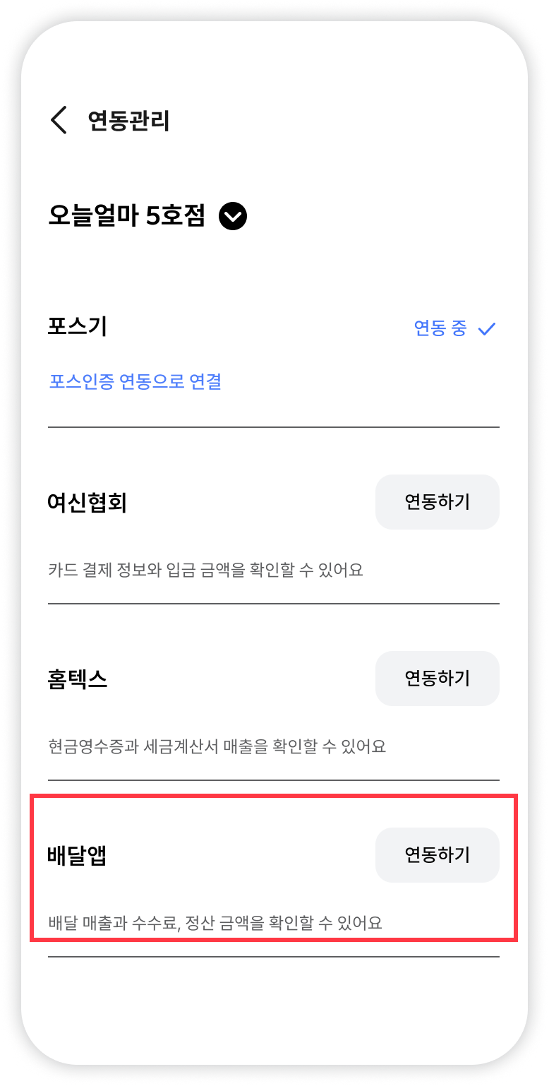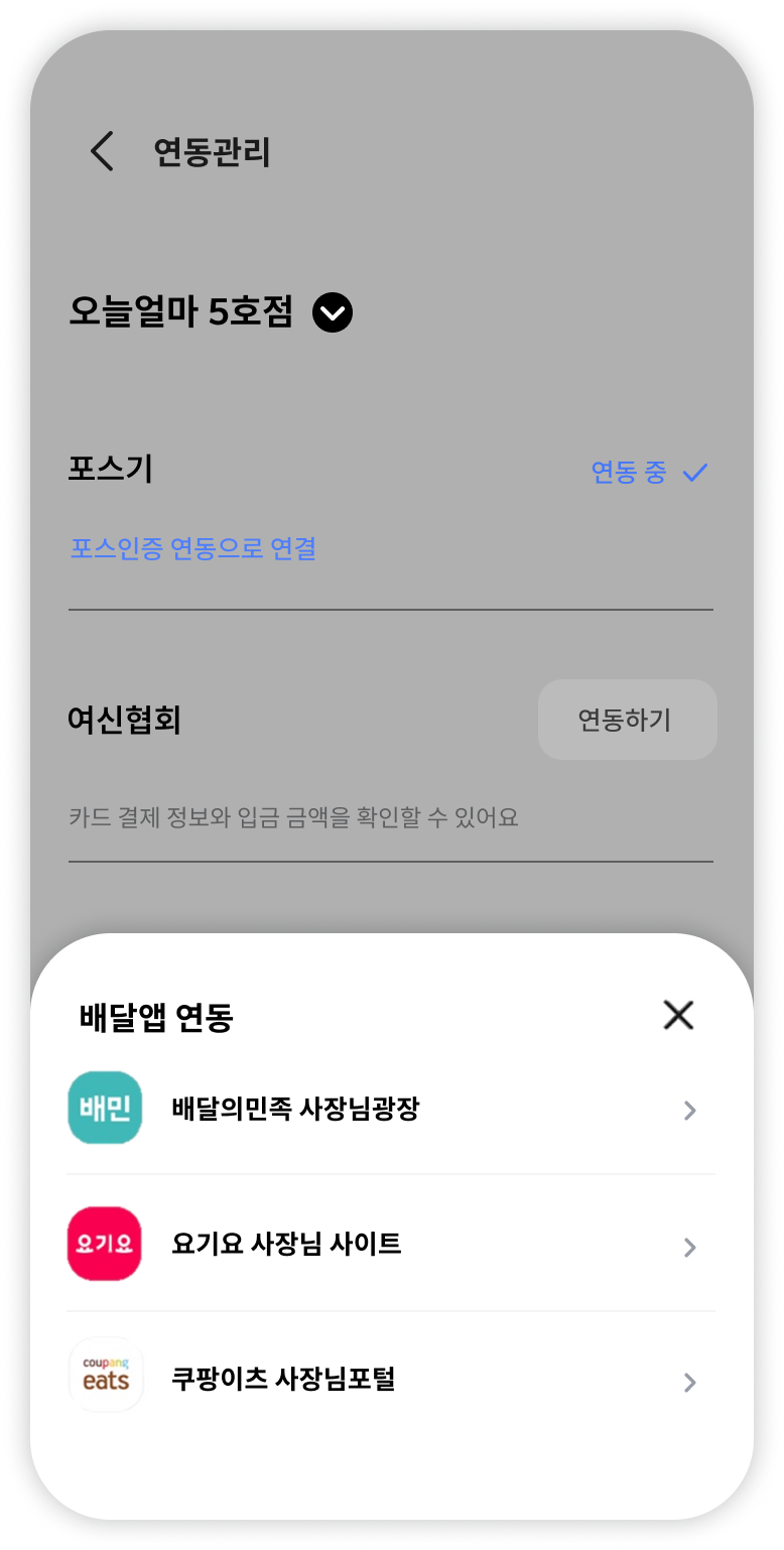 배달앱 연동은 배달의민족, 요기요, 쿠팡이츠 3사에 한하여 제공됩니다.