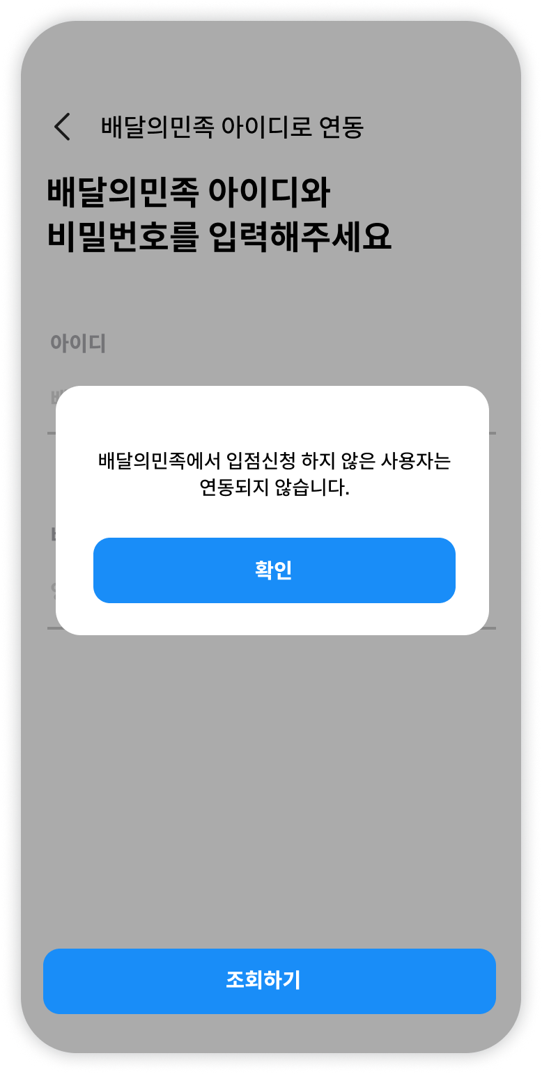 배달의민족에서 입점 신청을 거치지 않은 아이디는 연동되지 않습니다.