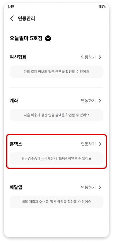 홈화면 [설정] > [연동관리] 버튼을 통해 여신협회와 홈택스 매출을 연동할 수 있어요.