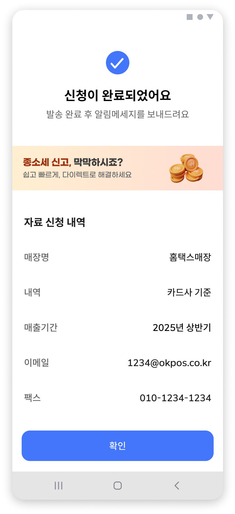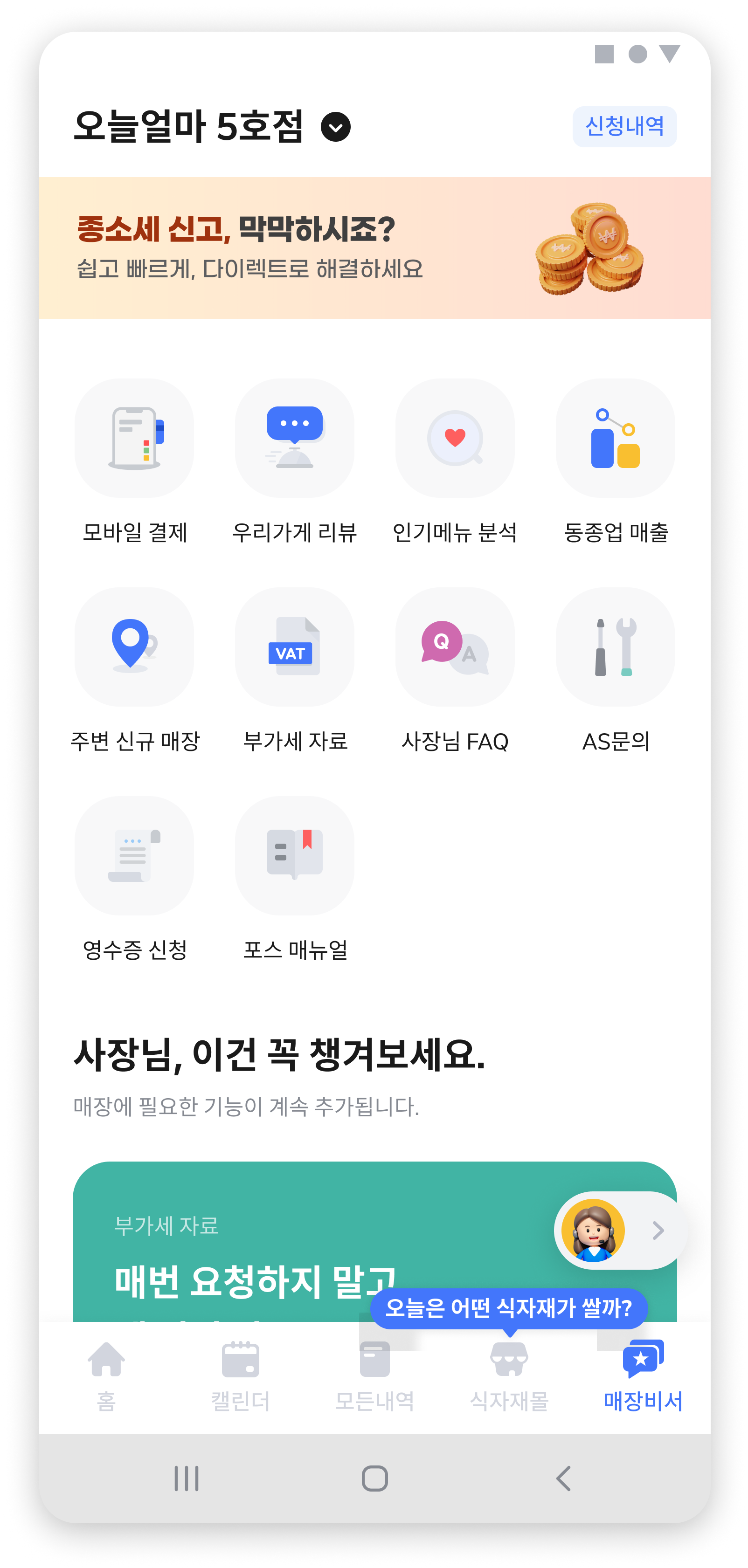 홈화면 [매장비서] > [부가세 자료 신청] 배너를 통해 부가세 매출 세액 조회와 자료 신청을 할 수 있어요.