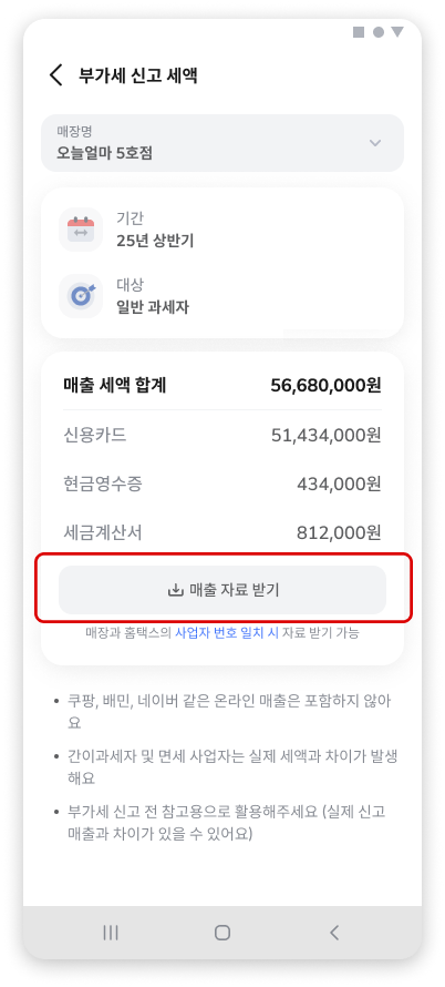 해당 매출 자료는 고객님들의 편의를 위해 제공하는 자료이니, 참고용으로만 확인해주시고, 실제 신고 전 금액 확인을 반드시 진행해주세요.