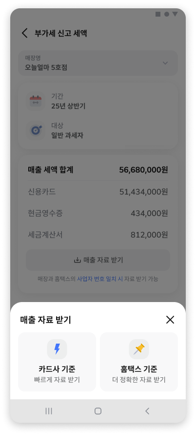 이제 오늘얼마 앱에서 부가세 매출 세액 조회와 부가세 신고를 위한 매출 자료를 신청할 수 있어요!