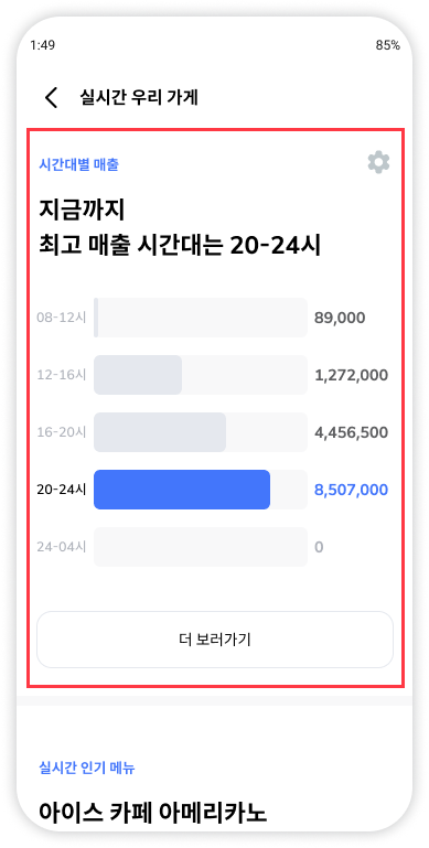 메인홈에서 안내하는 시간대별 매출은 일부 오케이포스 가맹점의 영업정보시스템(ASP) 설정에 따라 안보이는 곳이 있을 수 있습니다.