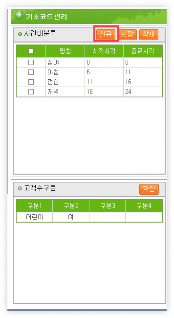 3) [매장 정보관리]화면 우측의 기초코드 관리에서 [시간대분류] > [신규]버튼을 클릭해 매출 구분을 원하는 시간대를 추가합니다.