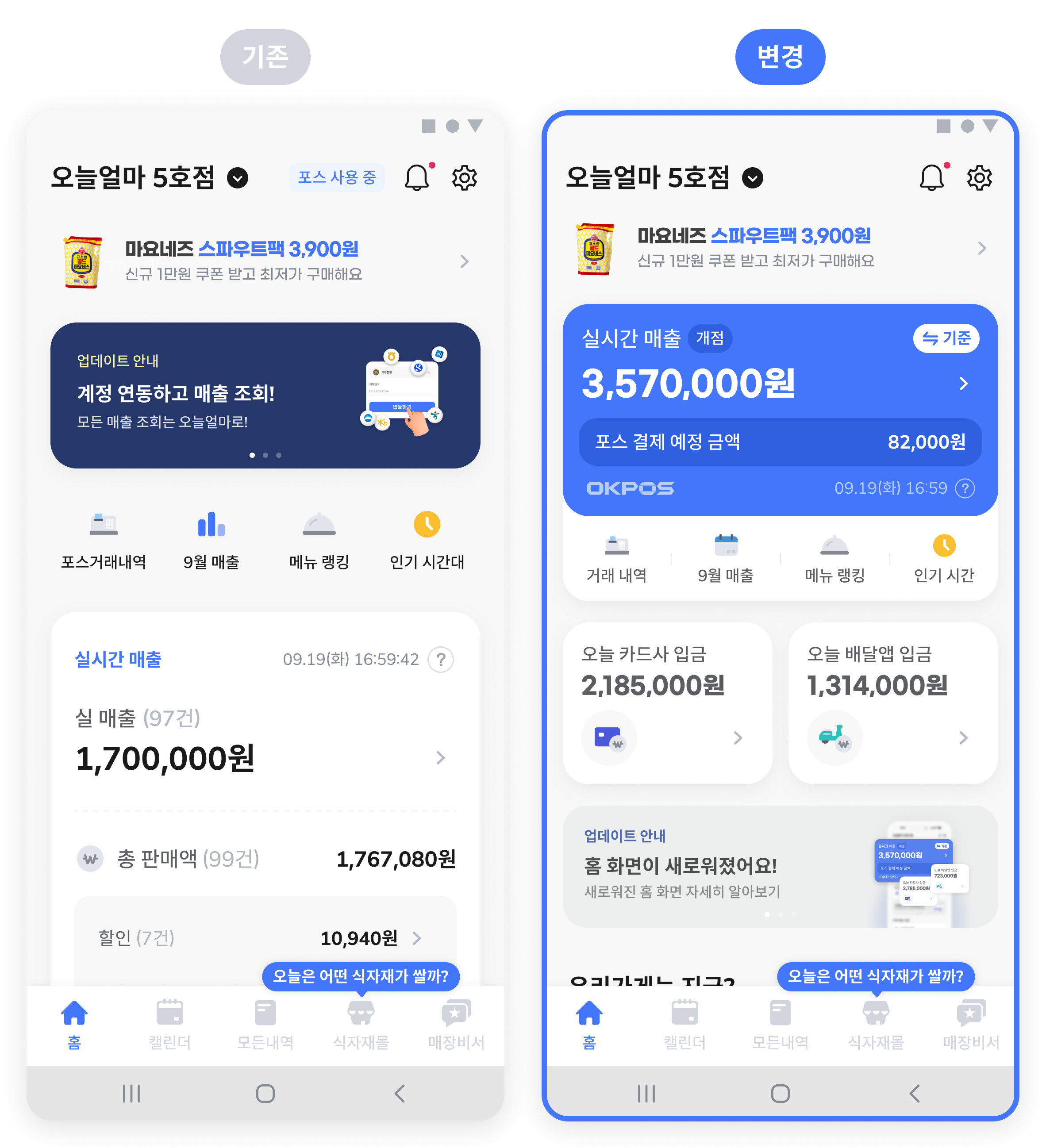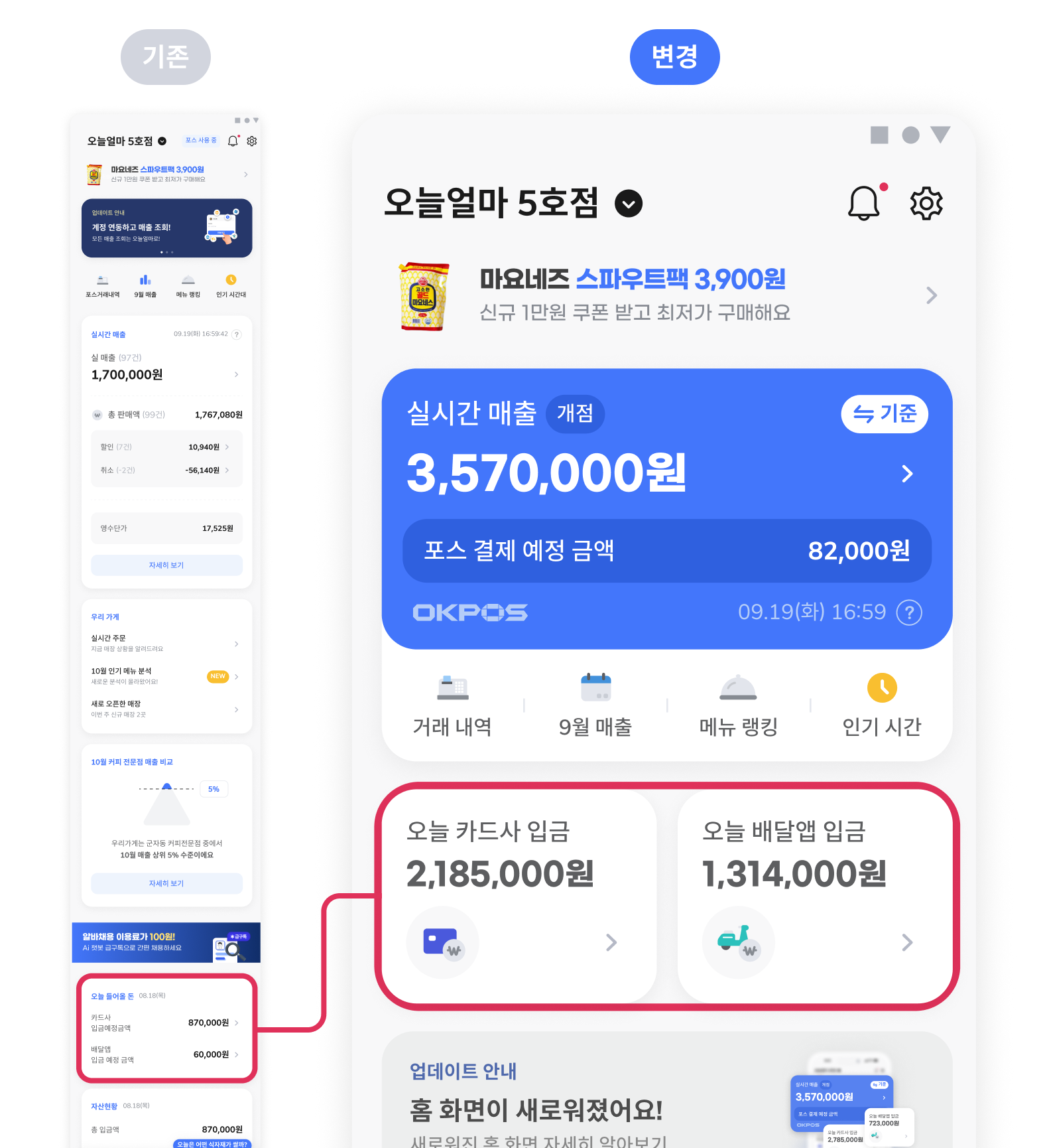 ๋ฉ์ธํ ์๋จ์ ์ฌ์ฅ๋๊ป ํ์ํ ํต์ฌ ์ ๋ณด๋ฅผ ๋ด์์ด์.์ฌ์ฅ๋๋ค์ด ๊ฐ์ฅ ๋ง์ด ์ฌ์ฉํ๋ ๊ธฐ๋ฅ์ธ ๋งค์ถ ์ ๋ณด, ์ ๊ธ ์์ ์ ๋ณด๋ฅผ ์ฑ ์ ์ ์ ํ๋ฒ์ ๋ฐ๋ก ํ์ธ ํ ์ ์๋๋ก ๋ฉ์ธํ ์๋จ์ผ๋ก ๋ฐฐ์น๋ฅผ ๋ฐ๊ฟจ์ด์.