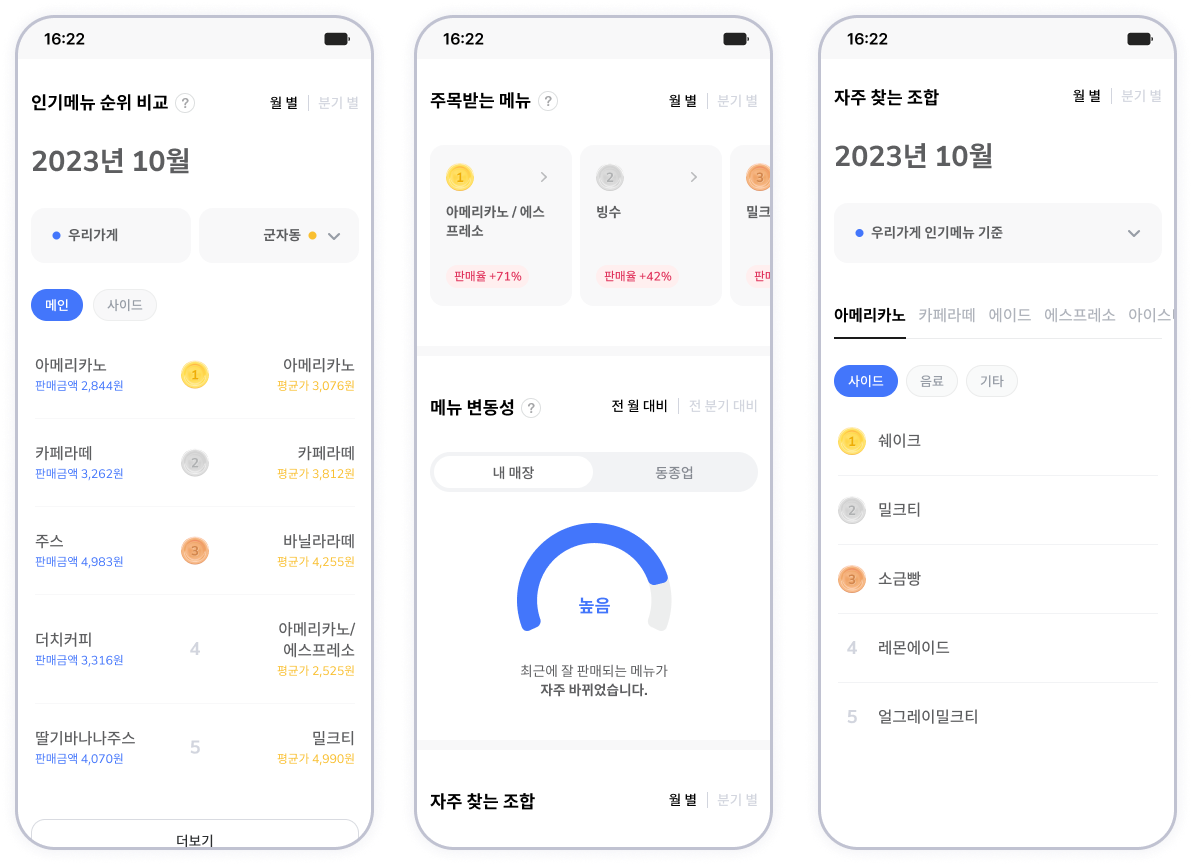 ๋ฉ๋ด ๋ณ๋์ฑ : ์ ํ๋ฆฌ๋ ๋ฉ๋ด๊ฐ ์์ฃผ ๋ฐ๋๋ ํธ์ธ์ง ๋ณ๋์ฑ ์งํ๋ก ์๋ ค๋๋ ค์.๋ด ๋งค์ฅ๊ณผ ์๊ถ์ ๋น๊ตํด ๋ณด์ธ์.