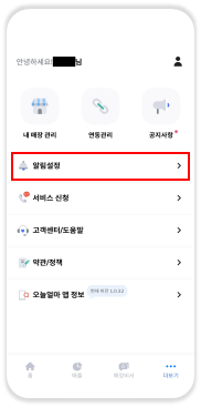 (2)설정 리스트에서 [알림설정]을 선택해 알림설정 화면으로 이동합니다.