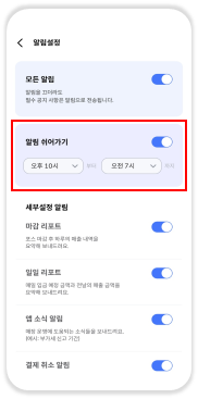 (3)'알림 쉬어가기'를 눌러 활성화 시키고, 알림을 받지 않을 시간대를 설정합니다.