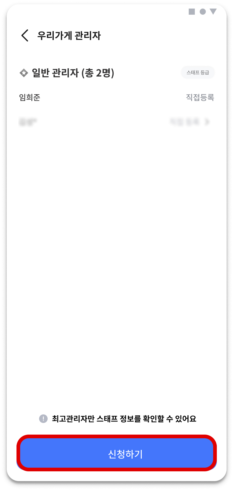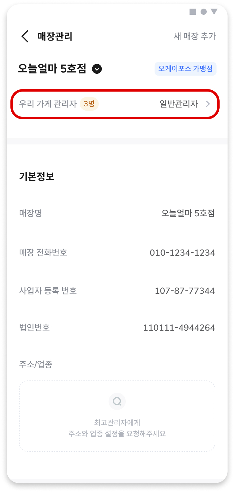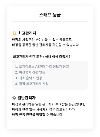 최고관리자는 매장의 사업주만 부여 받을 수 있는 등급이에요. (한 사업자번호에 최고관리자는 한 명만 가능해요.)