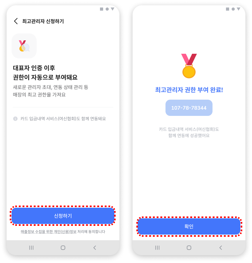 *신청하기 버튼이 보이지 않을 경우, 이미 해당 사업자번호에 최고관리자가 있는 상태에요.