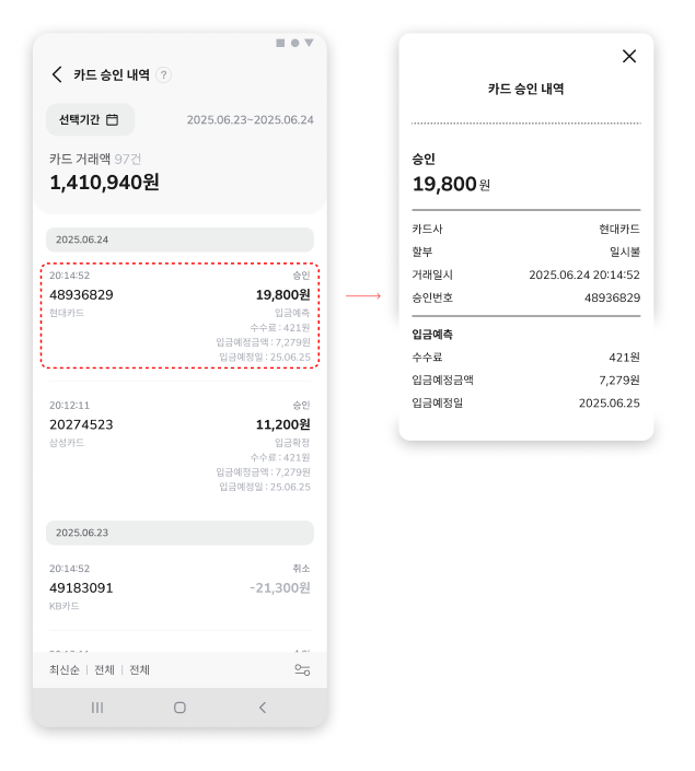 카드 승인 내역과 승인 건에 대한 입금 예정 상세 정보를 확인하는 페이지에요.