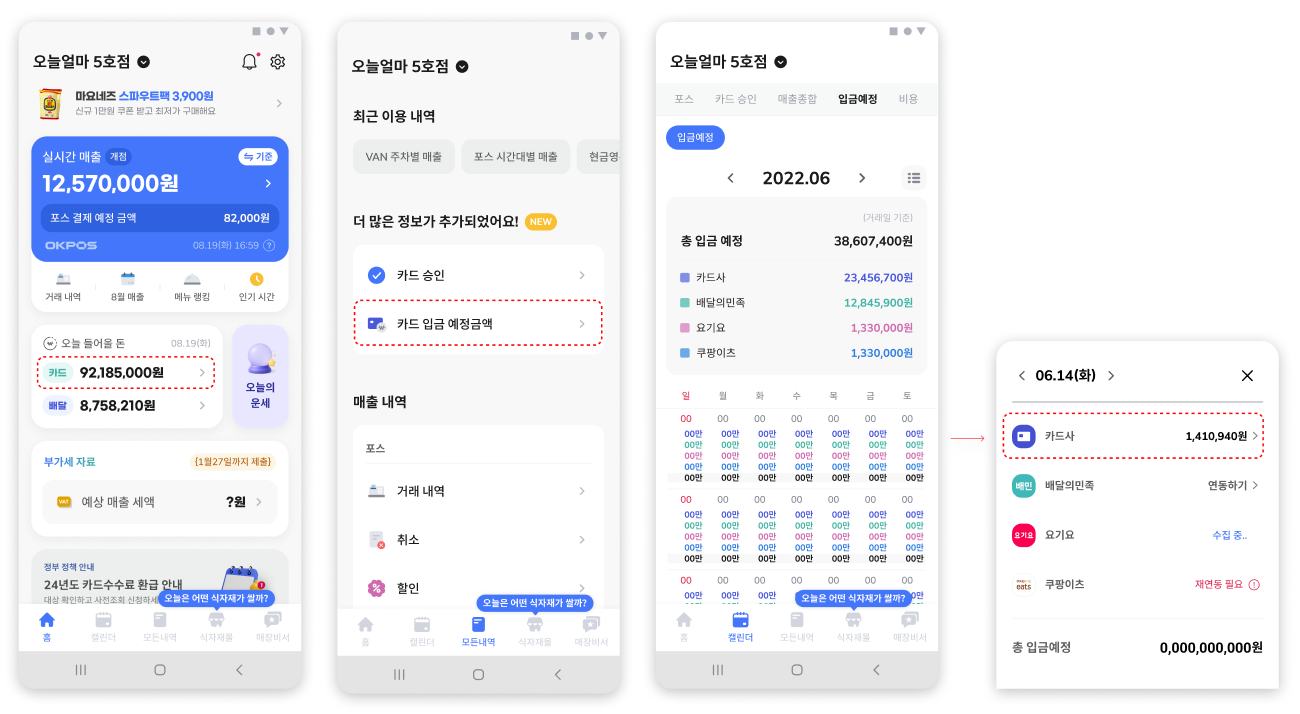 [카드 입금 예정금액]에서 카드사별 입금액과 매출 내역을 확인할 수 있어요.
