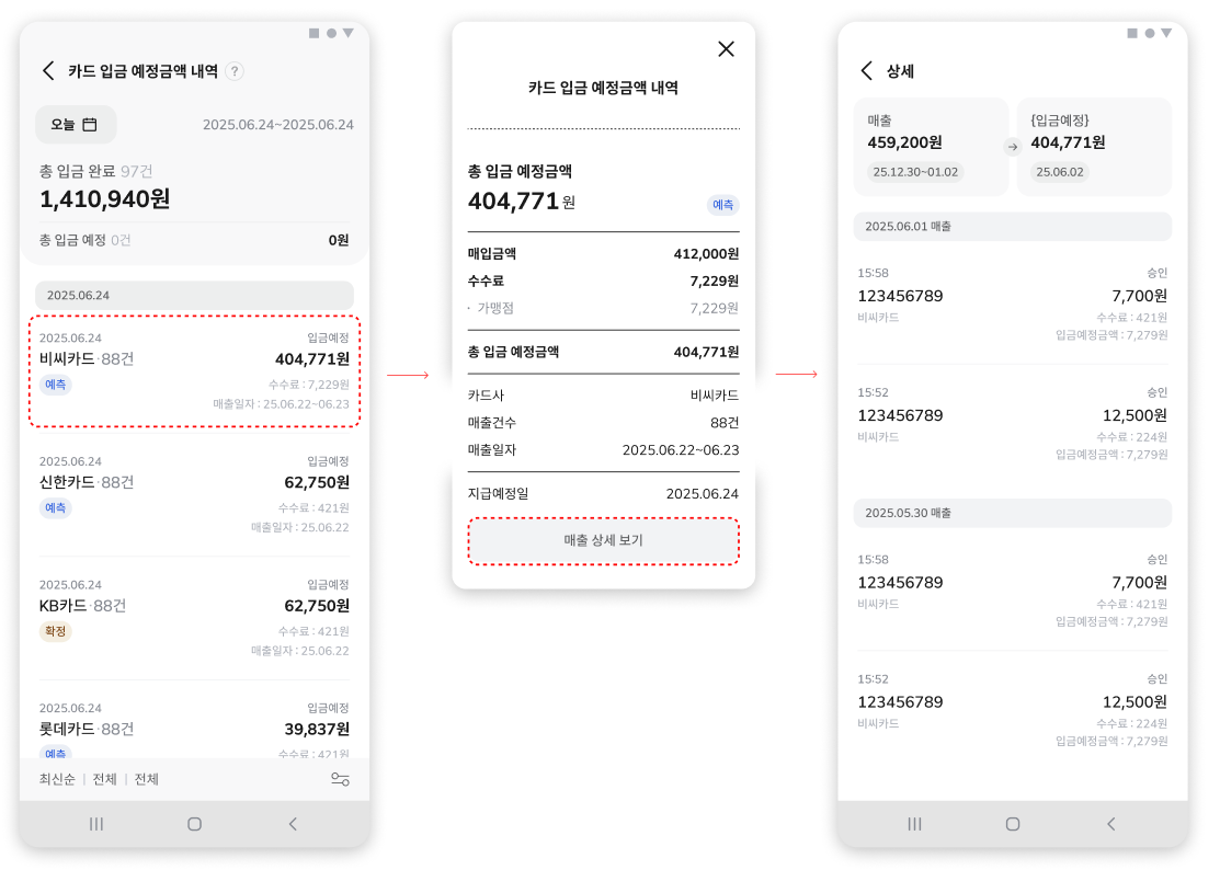 카드 승인 상세내역 (입금상태, 입금예정일, 입금예정금액, 수수료)