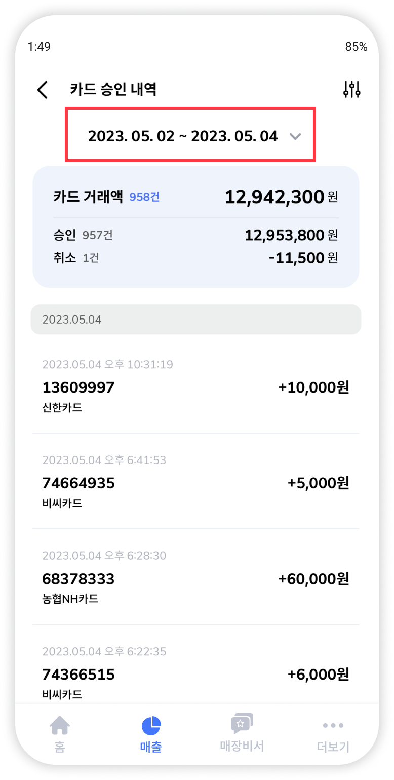 오늘얼마에 등록한 매장의 사업자 번호와 연동한 여신협회 계정의 사업자 번호가 일치해야 카드 승인 내역 조회가 가능합니다. 카드 승인 내역 조회가 되지 않는 경우 사업자 번호 일치 여부를 확인해주세요