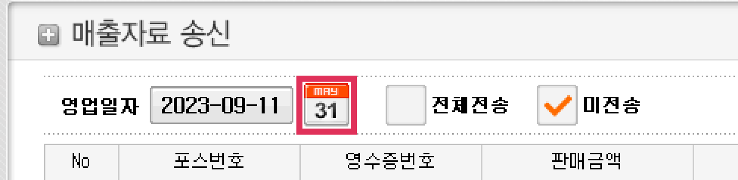 5) 만약 과거 날짜 조회가 필요하면 영업일자 옆 달력 모양 아이콘을 클릭해주세요.