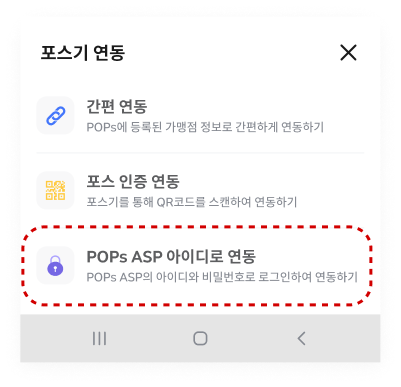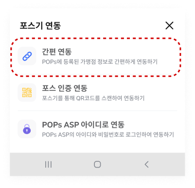 포스 연동은 [간편연동 / 포스 인증 연동 / POPs ASP 아이디로 연동] 세 가지 중 원하는 연동 방법으로 선택합니다.