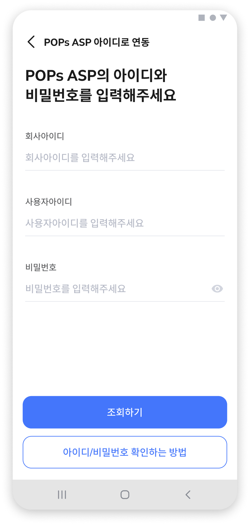 (2) POPs ASP에 등록된 회사 아이디, 사용자 아이디와 비밀번호를 입력하고 [조회하기] 버튼을 눌러주세요.