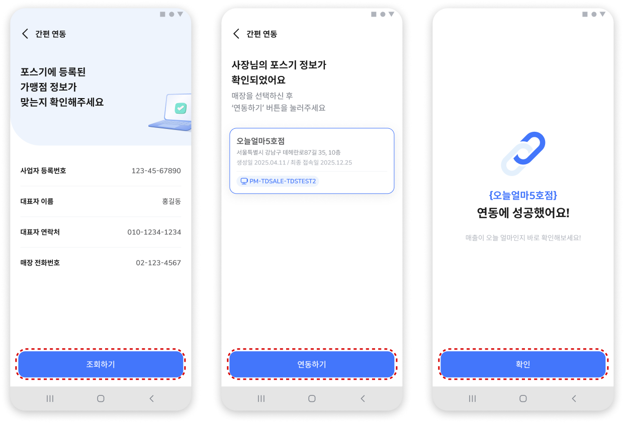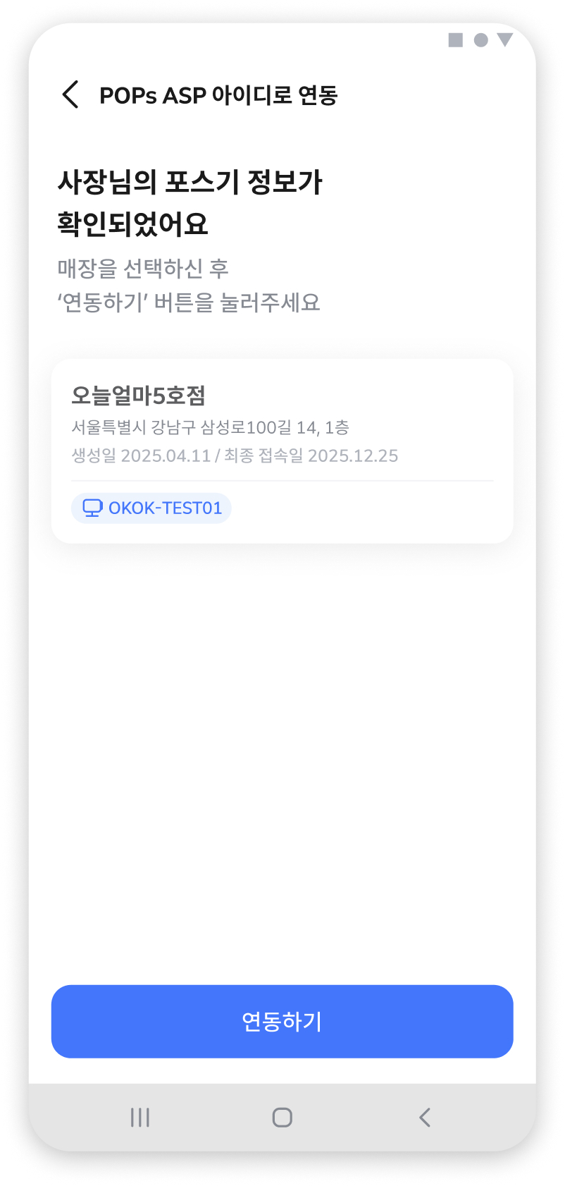 간편연동 : 앱 내에서 등록한 매장+사장님정보와 팝스 영업정보시스템(POPs ASP)에 등록 된 매장+사장님정보가 일치하면 바로 연동