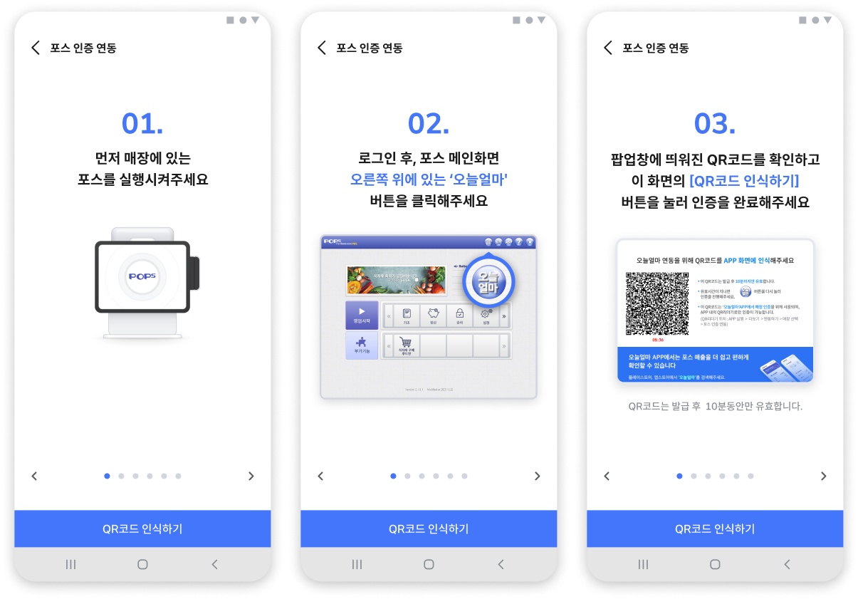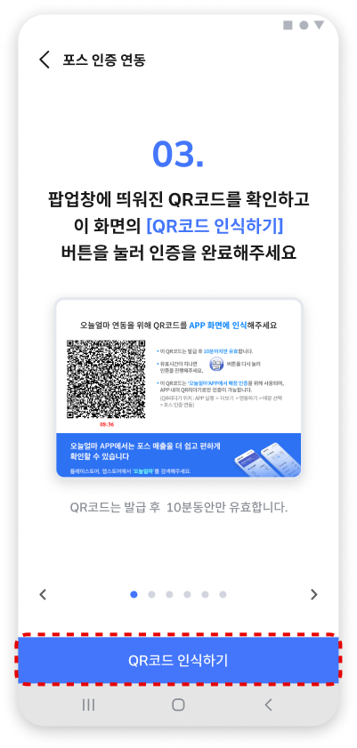 포스인증 연동 : 매장에 설치된 포스 화면에 QR코드를 발급받아 인증하여 연동