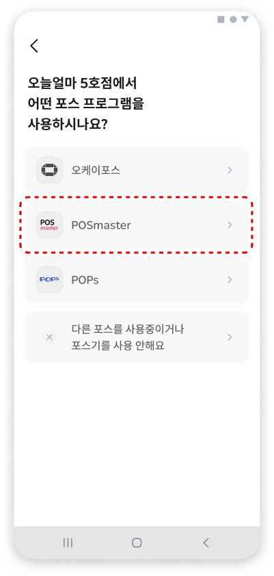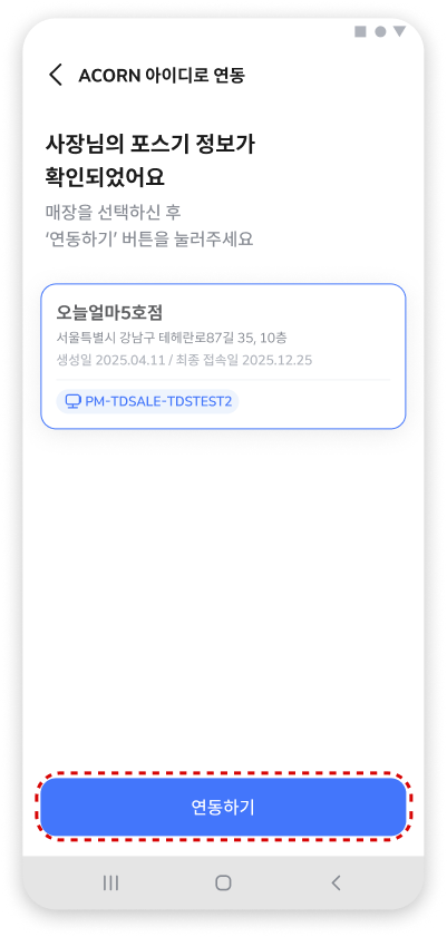 간편연동 : 앱 내에서 등록한 매장+사장님정보와 포스마스터 영업정보시스템(ACORN)에 등록 된 매장+사장님정보가 일치하면 바로 연동