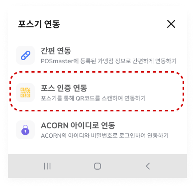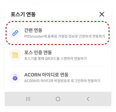 포스 연동은 [간편연동 / 포스 인증 연동 / ACORN 아이디로 연동] 세 가지 중 원하는 연동 방법으로 선택합니다.